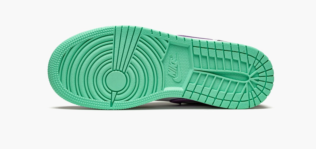 The Air Jordan 1 Low GS "Black/Violet Shock/Green Glow" is a colorful makeup of the youth sizing of