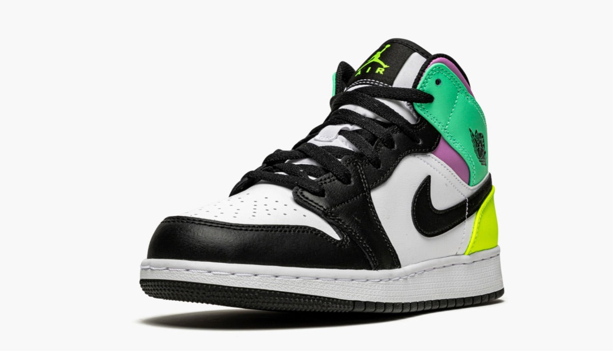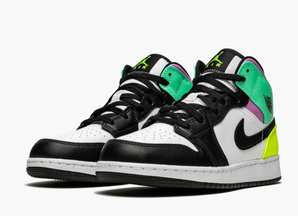 The Air Jordan 1 Mid GS “Pastel” is a vibrant, kids' exclusive colorway of Michael Jordan’s first signature shoe in the popular mid-top silhouette. A combination of head-turning neon and pastel colors on the leather panels attracts attention on the “Pastel” Jordan 1 Mid. The forefoot, eyelets, and Swoosh feature a black leather construction. Both the perforated toe and the mid-panel are designed in white leather. A black “Wings” logo appears on the Green Glow leather panel layered above the purple leather collar. A contrasting Volt leather panel can be found on the heel. Additional Volt accenting appears on the Jumpman and “Air” branding on the black nylon tongue tag. Black laces, a white nylon tongue, and a white midsole and black outsole complete the look.