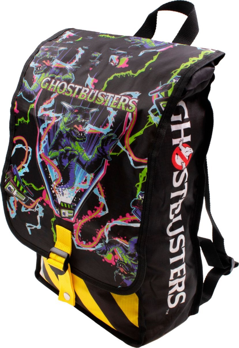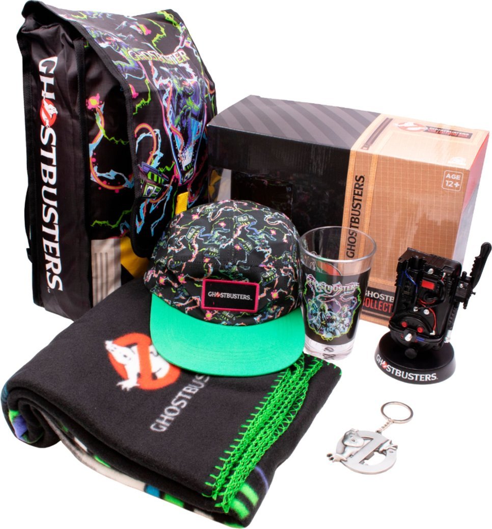 Includes a Ghostbusters backpack, Stay Puft Marshmallow Man blanket, a hat, Ghostbusters logo keychain, pint glass, and a proton pack vinyl figure