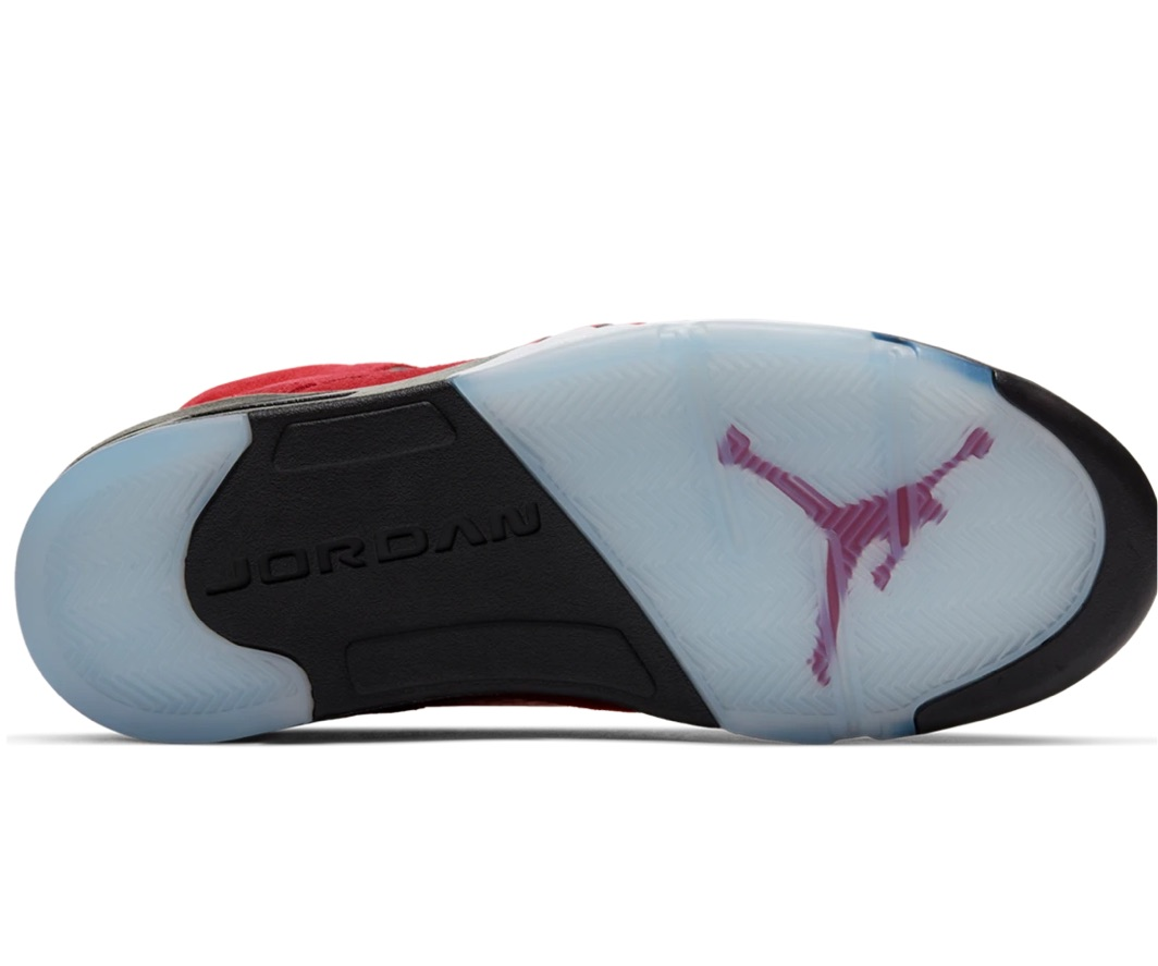Underfoot, the black painted midsole features red and-white shark tooth detailing and a clear Air unit in the heel retains the Jordan 5's original design.