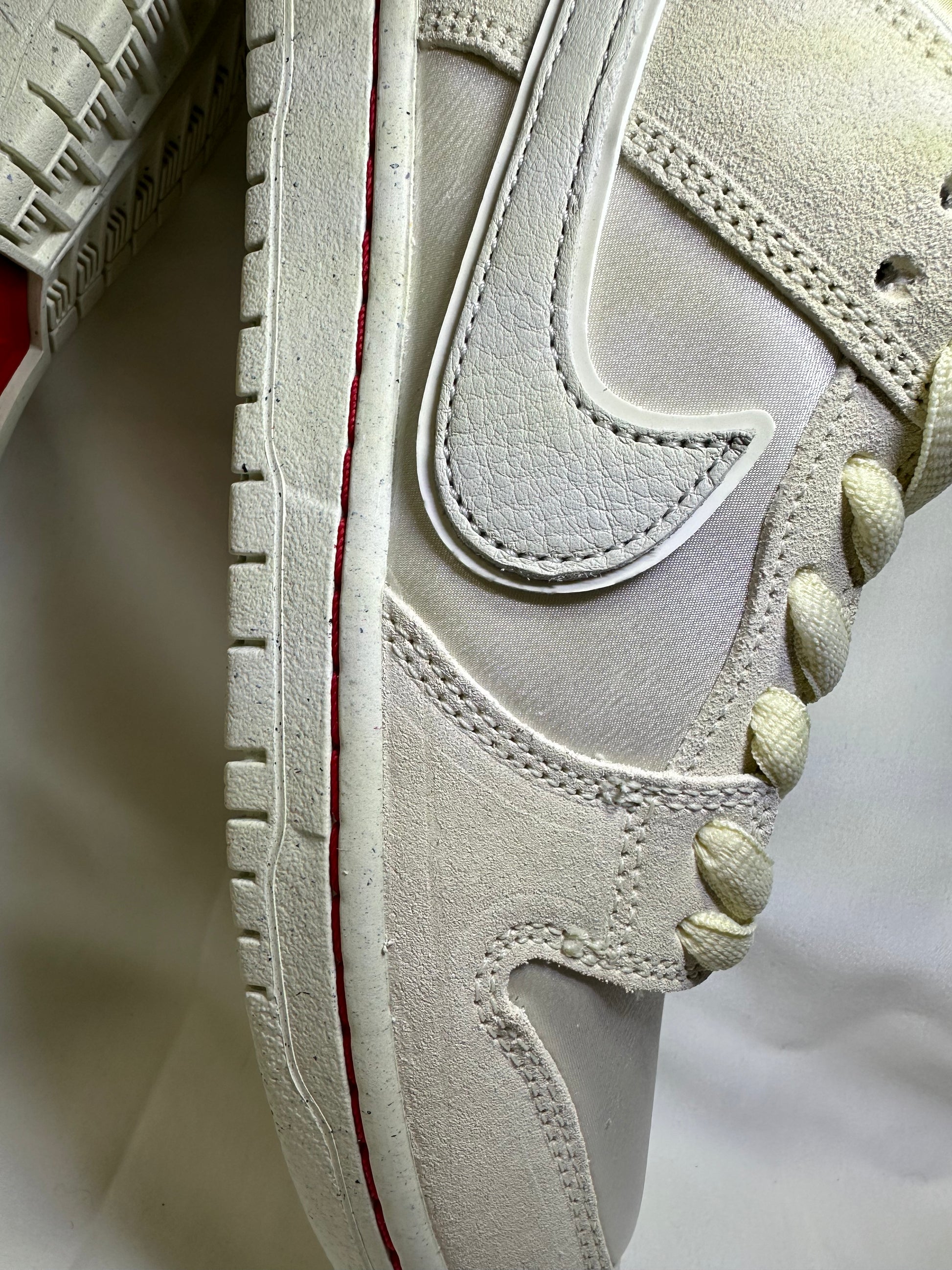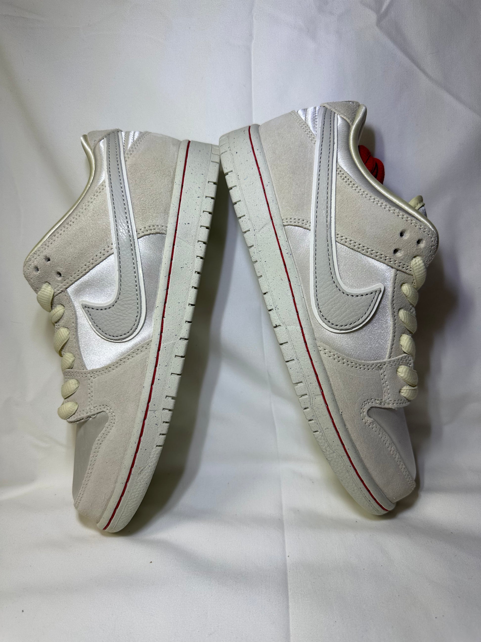 The Nike Dunk Low Premium SB ‘Light Bone’ represents one half of the ‘City of Love Collection.' The white satin upper gets ivory suede overlays at the heel and forefoot areas, while a tumbled leather Swoosh keeps the monochromatic look. Nodding to the mythic red thread of fate, the sockliners show two hands linked by red string tied around the pinky finger. This theme repeats with red stitching surrounding the off-white rubber midsole.